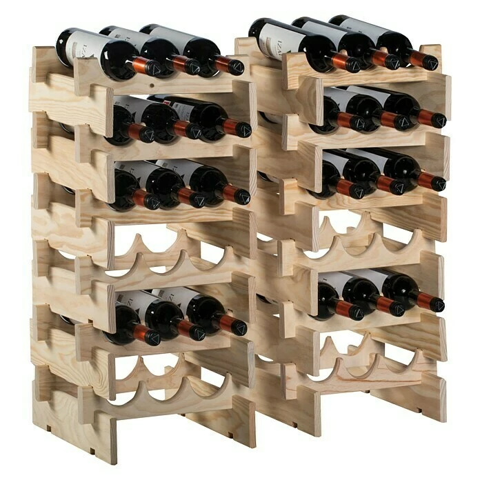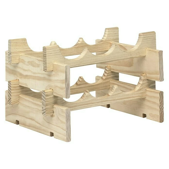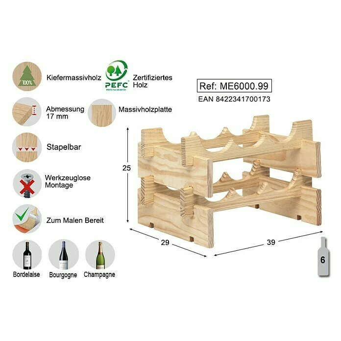 Das Weinregal aus massivem Kiefernholz ist stapelbar und hat ein Fassungsvermögen von 6 Flaschen. Außerdem garantiert die Herstellung aus hochwertigem Material seine Widerstandsfähigkeit und lange Lebensdauer.