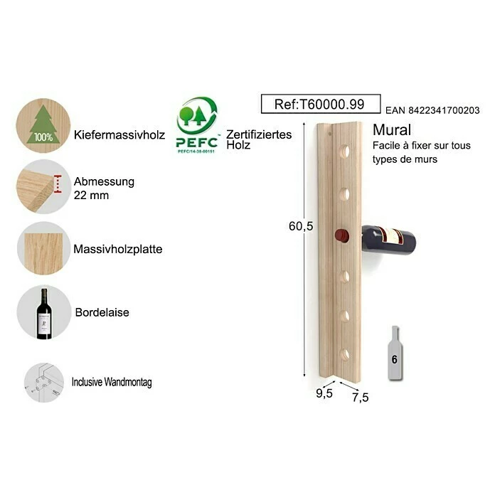 Das Weinregal aus massivem Kiefernholz ist stapelbar und hat ein Fassungsvermögen von 6 Flaschen. Darüber hinaus garantiert die Herstellung aus hochwertigem Material seine Widerstandsfähigkeit und lange Lebensdauer.