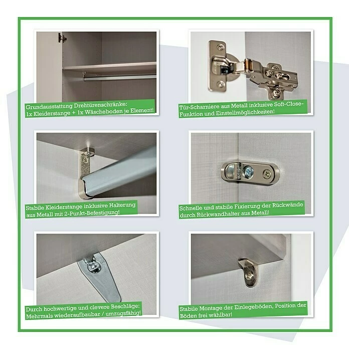 Der Kleiderschrank Swift von Express Möbel ist ein moderner Drehtürschrank, der in unterschiedlichen innen Ausstattungen, Dekoren, mit Spiegeln oder Glasfronten erhältlich ist. In den oberen Ablagefächern können Decken, Hüte oder Ähnliches sicher verstaut werden. Die Kleiderstangen eignen sich zur knitterfreien Aufbewahrung der Kleidungsstücke. Der aufgeteilte Innenbereich wird von den Türen verdeckt. Die Drehtüren mit alufarbenen Griffen und Dekorbeschichtung sind mit einer Soft-Close-Funktion ausgestattet, die für geräuscharmes und sanftes Schließen sorgt. Der Swift ist aus Holzwerkstoff gefertigt und verfügt über hochwertige Metallbeschläge. Er ist wiederaufbaubar und somit umzugstauglich.