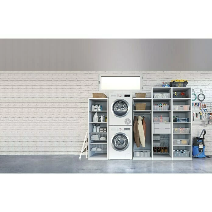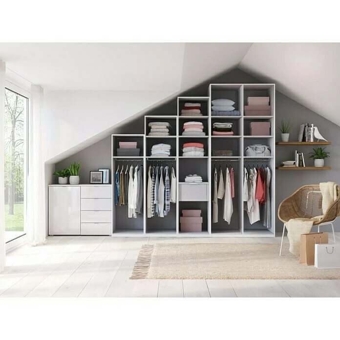 Mit dem modularen Schrank-Programm ESCALO von Express Möbel kreieren Sie im Handumdrehen Ihre persönliche, multi-variable Aufbewahrungslösung für jede Raumsituation. Durch die Auswahl aus vier verschiedene Elementhöhen und zwei Elementtiefen statten Sie auch niedrige Raumhöhen, Dachschrägen oder schmale Durchgänge ideal mit Stauraum aus. Durch die Kombination einzelner, freistehender Schrankelemente bleiben Sie langfristig flexibel, in dem Sie jederzeit Ihre Schrankkonfiguration verkürzen, verlängern oder aufteilen können. Den Innenraum des Schrankes gestalten Sie mit dem zusätzlich erhältlichen Zubehör ganz nach Ihren Wünschen. Hierdurch schaffen Sie sich Ihre ganz persönliche Lösung für Home Office, Garderobe, Haushalts- oder Vorratsraum oder Garage. Lassen Sie sich hier von unseren Konfigurationsbeispielen in den Produktbildern inspirieren! Kombinieren Sie die Schrankelemente mit der gewünschten Drehtüren aus ESCALO, indem Sie ganz einfach die gewünschte Tür passend zur Elementhöhe auswählen und den passenden Griff dazu kombinieren. Mit dem passenden Griff erhalten Sie die für die Elementhöhe erforderlichen Topfband-Scharniere aus hochwertigem Metall mit Soft-Close-Funktion zur Montage der Drehtür. Der Türanschlag ist hier übrigens frei wähl- und wechselbar, damit Sie auch in Zukunft dieses Möbel auf neue Anforderungen anpassen können. Damit Sie und auch Ihre Umwelt sich lange mit diesen Möbelstücken wohlfühlen, wurden alle Möbelstücke klimaneutral aus FSC®- und PEFC-zertifizierten Holzwerkstoffe und ausschließlich Made in Germany produziert! Zur Montage einer Drehtür bitte den zur Höhe passenden Griff aus dem Programm ESCALO mitbestellen. Nur mit diesem Griff erhalten Sie auch die zur Türmontage notwendigen Topfband-Scharniere in der jeweils benötigten Anzahl. Separat erhältliches Zubehör muss passend zur Tiefe des Schranklementes bestellt werden. Bitte sichern Sie die einzelnen Schrankelemente mit der im Lieferumfang enthaltenen Kippsicherung.