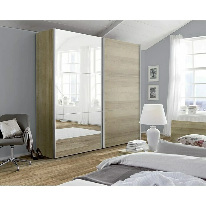 Der Kleiderschrank Stars von Express Möbel ist ein moderner Schwebetürenschrank der in verschiedenen Dekoren und Ausführungen erhältlich ist. Dank der Dämpfungsbeschläge schließen die Schranktüren besonders sanft und leise und zeichnet sich durch hohe Laufruhe und wunderbar leichten Bedienkomfort beim Öffnen und Schließen aus. Die angenehm gerundete Metallgriffleiste liegt dabei bestens in der Hand. In den oberen Ablagefächern der Schränke können Decken, Hüte oder Ähnliches sicher verstaut werden. Die Kleiderstangen eignen sich zur knitterfreien Aufbewahrung der Kleidungsstücke. Der aufgeteilte Innenbereich wird durch die Türen verdeckt. Die Schwebetüren sind mit einem Staubschutz ausgestattet, welcher das Verstauben des Innenbereichs verhindert. Der Stars ist aus Holzwerkstoff gefertigt und verfügt über hochwertige Metallbeschläge. Er ist wiederaufbaubar und somit umzugstauglich.