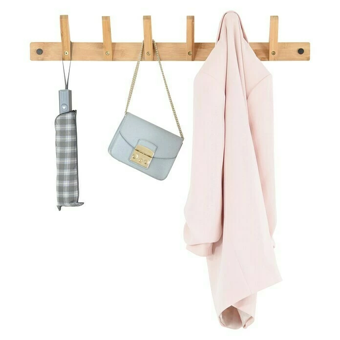 Die Garderobe zeichnet sich durch ihr schlichtes Design aus. Die Garderobenleiste ist mit 6 Haken ausgestattet und besteht auf Bambus. Das besondere bei dieser Wandgarderobe ist, dass sie sowohl horizontal aus auch vertikal montiert und genutzt werden kann. Die Montage erfolgt einfach und bequem an der Wand über Schrauben.