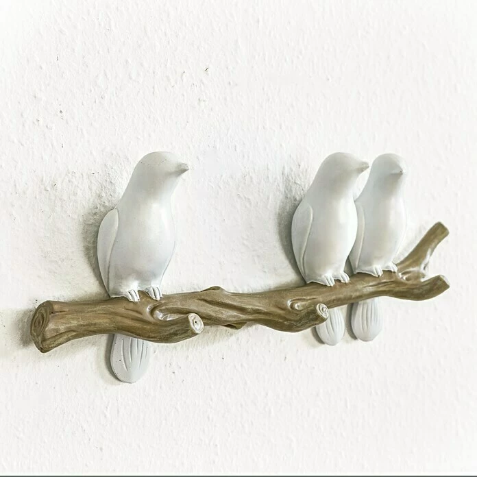 Diese Garderobenleiste mit Vögeln sitzend auf einem Ast und drei stabilen Haken erlaubt das Aufhängen von Jacken, Mützen und Schals.