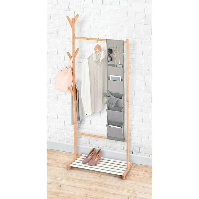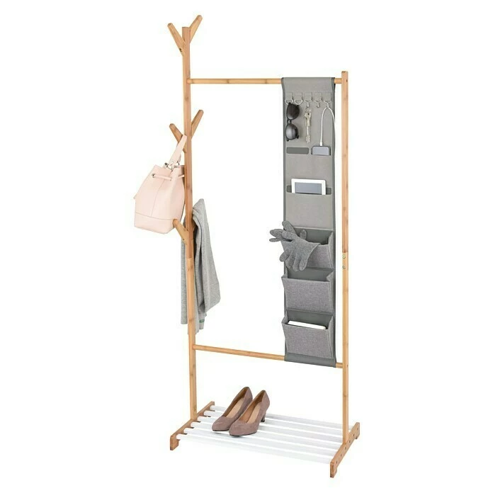 Der Hanging Organizer Garderobenständer ist eine praktische und kostengünstige Lösung bei Platzmangel. Diese originelle Garderobe aus Bambus verfügt über einen hängenden Filz-Organizer mit verschiedenen Taschen und Fächern zum Aufbewahren von kleinen Accessoires. Außerdem enthält es sechs Haken zum Aufhängen von Mützen oder Schals und eine untere Ablage für Schuhe und Stiefel.