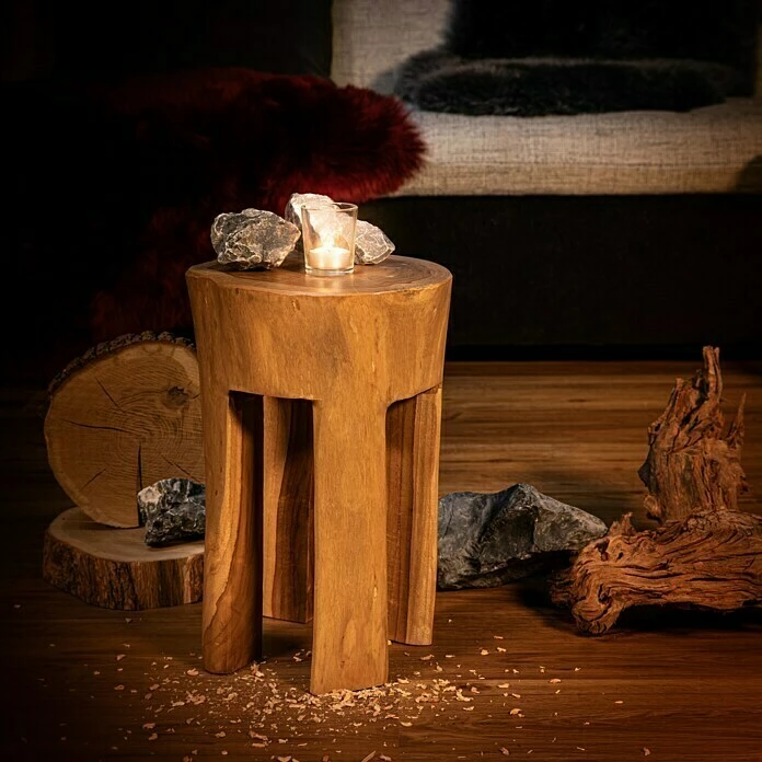 Der Hocker aus Teakholz ist ein Blickfang in jedem Wohnraum und eignet sich auch ideal als Beistelltisch oder zur Präsentation von Pflanzen. Das Sitzmöbel mit vier Füßen ist naturbelassen und aus einem massiven Teakstamm geschnitzt. Die lebendige Maserung, Einkerbungen sowie Äste geben dem Teakhocker sein individuelles Äußeres und sind kein Reklamationsgrund. Jeder Hocker ist ein Unikat, die Maße sind daher ca.-Angaben. Den Hocker stets so platzieren, dass Luft an das Holz kommt. Ist dies nicht gewährleistet, können sich Pilze bilden, da das Material nicht vollständig ausgetrocknet ist.