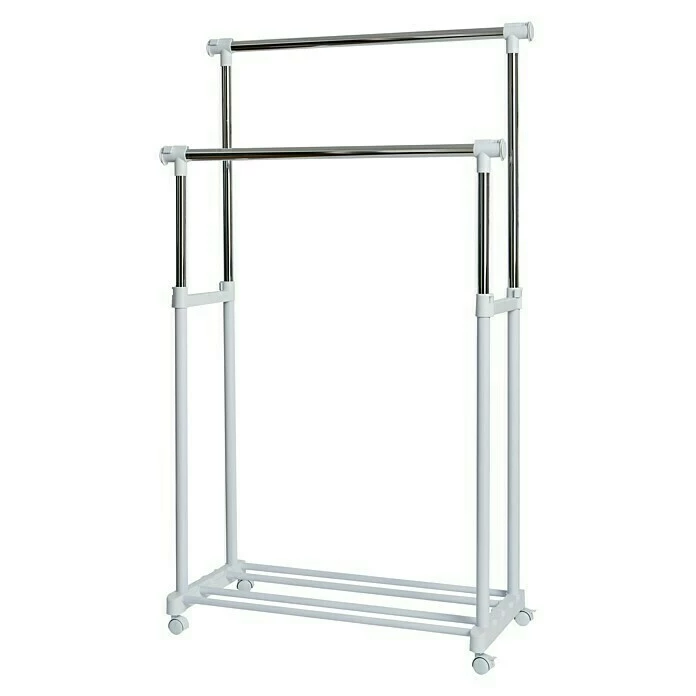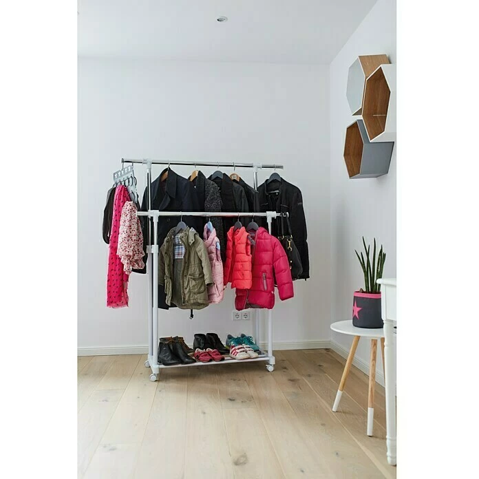 Der Kleiderständer XXL eignet sich zum Verstauen von Jacken und Schuhen. Er ist mit einer doppelten Teleskopkleiderstange ausgestattet um ein Maximum an Stauraum zur Verfügung zu stellen. Der Kleiderständer lässt sich einfach, ohne Schrauben, durch ein Stecksystem aufbauen und lässt sich dank der Rollen bequem verschieben. Die Belastbarkeit beträgt 30 kg/Stange.