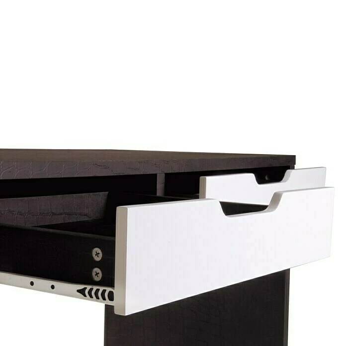 Der Schreibtisch Croco von Phönix bietet durch seine zwei geräumigen Schubladen großzügigen Stauraum. Die weißen Schubladen sind hochglänzend und stehen farblich in Kontrast zu dem braunen Tisch. Der Tisch, der auch als Schminktisch verwendet werden kann, ist in trendiger Krokoleder-Optik gehalten, die als Hingucker in jedem Raum fungiert.