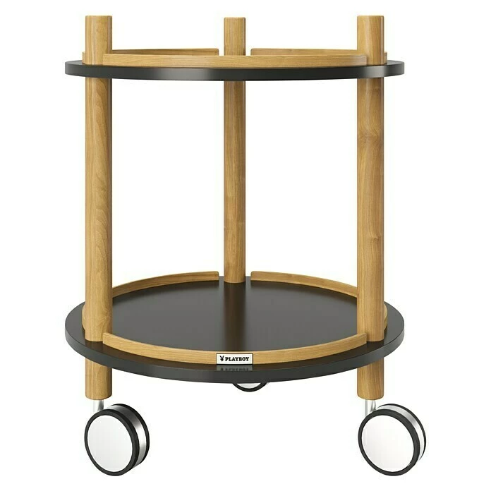 Der Rolltisch Carly aus der Playboy-Home Kollektion ist im Club-Stil der 60er Jahre gehalten. Die 3 schwarzen Ablagen und Holzakzenten runden das Retro-Design vollkommen ab. Der praktische Tisch lässt sich durch die 3 Rollen einfach verschieben und eignet sich für alle Räumlichkeiten. Die beiden Böden bieten genügen offene Ablagefläche für Ihre Dinge. Der mobile Beistelltisch ist auch als Servierwagen gut geeignet. Alle Artikel der Playboy-Home Kollektion sind farblich und im Design aufeinander abgestimmt. Alle Möbel und Accessoires ergeben zusammen ein wertiges Gesamtkonzept.