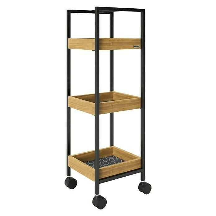 Der Rolltisch Nancy aus der Playboy-Home Kollektion ist im Club-Stil der 60er Jahre gehalten. Die 2 schwarzen Ablagen mit Holzakzenten kombiniert mit dem schwarzen Metallgestell runden das Retro-Design vollkommen ab. Der praktische Tisch lässt sich durch die 4 Rollen einfach verschieben und eignet sich für alle Räumlichkeiten. Die zwei Böden bieten ausreichend Ablagefläche für Ihre Dinge. Der mobile Beistelltisch ist auch als Servierwagen gut geeignet. Alle Artikel der Playboy-Home Kollektion sind farblich und im Design aufeinander abgestimmt. Alle Möbel und Accessoires ergeben zusammen ein wertiges Gesamtkonzept.