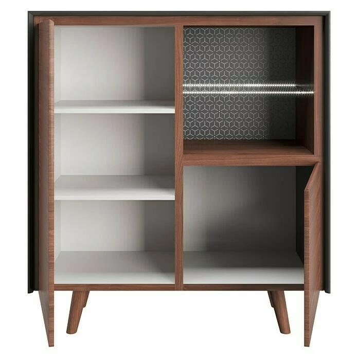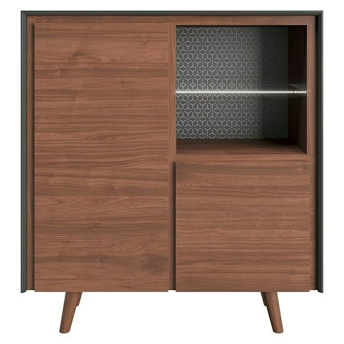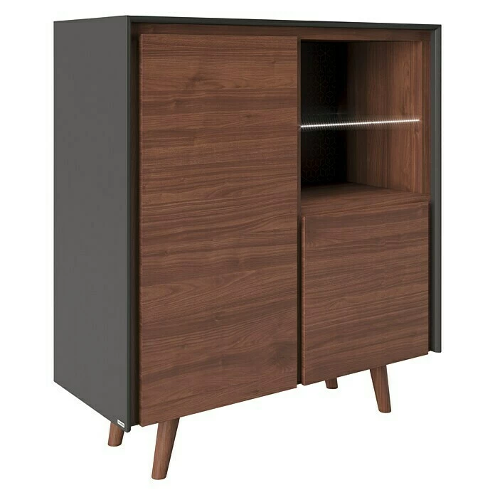 Die Hochkommode Victoria aus der Playboy-Home Kollektion von Phönix ist im Club-Stil der 60er Jahre gehalten. Der graue Korpus kombiniert mit dem Nussbaum-Dekor und Massivholzfüssen runden das Retro-Design vollkommen ab. Die praktische Kommode mit 2 Türen und mit 2 offenen Ablagen mit Glasboden und LED bieten genügend Stauraum und Ablagefläche für Ihre Dinge. Die Türen mit Soft-Close Technik lassen sich durch die gefrästen Fronten einfach öffnen und durch leichtes anstoßen sanft schließen. Die LEDs sind über eine Fernbedienung steuerbar und leuchten in sieben Farben. Alle Artikel der Playboy-Home Kollektion sind farblich und im Design aufeinander abgestimmt. Alle Möbel und Accessoires ergeben zusammen ein wertiges Gesamtkonzept.