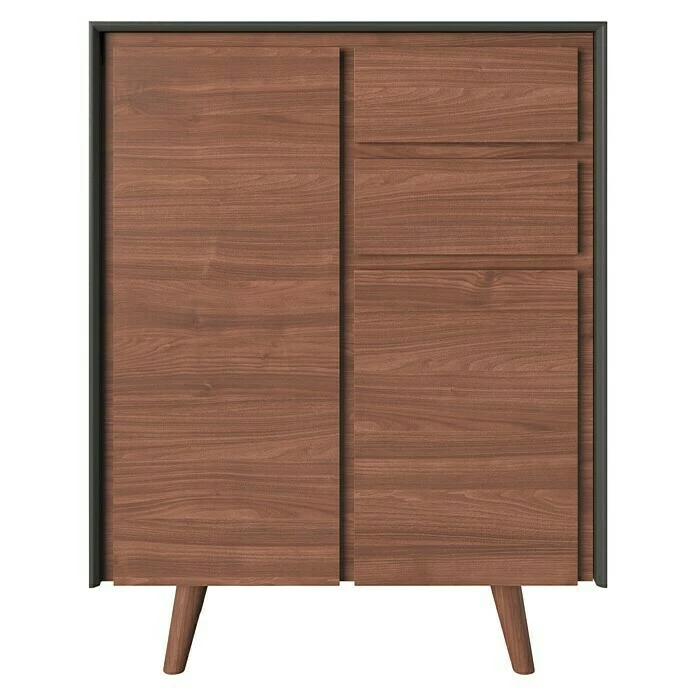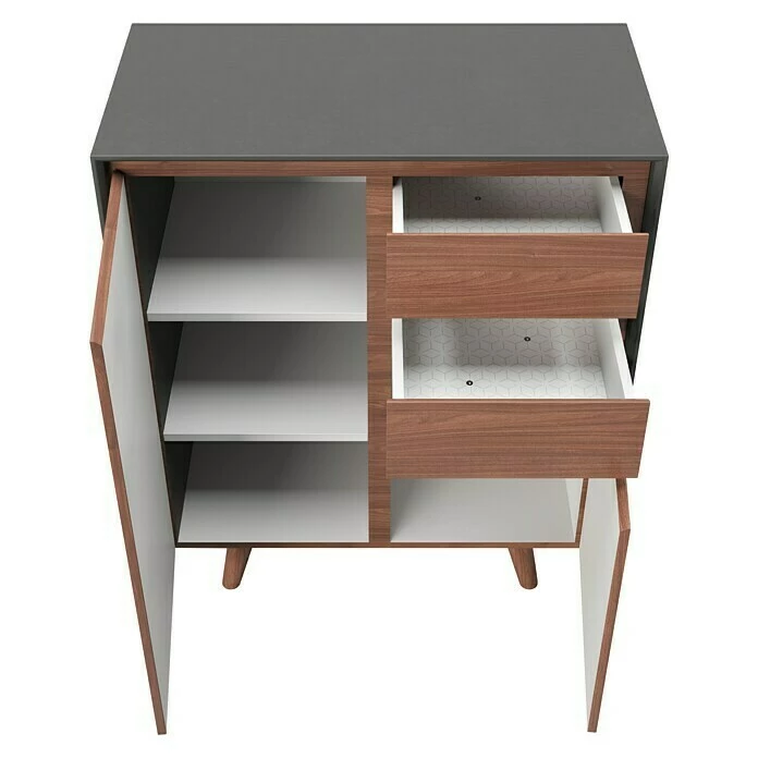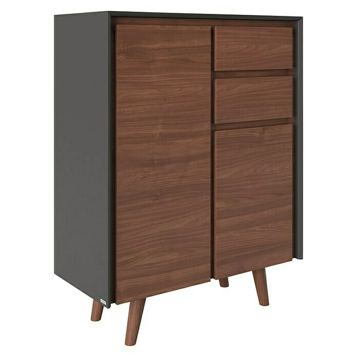 Die Hochkommode Victoria aus der Playboy-Home Kollektion von Phönix ist im Club-Stil der 60er Jahre gehalten. Der graue Korpus kombiniert mit dem Nussbaum-Dekor und Massivholzfüssen runden das Retro-Design vollkommen ab. Die praktische Kommode mit 2 Türen und mit 2 Schubladen bieten genügend Stauraum und Ablagefläche für Ihre Dinge. Die Türen und Schubladen mit Soft-Close Technik lassen sich durch die gefrästen Fronten einfach öffnen und durch leichtes anstoßen sanft schließen. Alle Artikel der Playboy-Home Kollektion sind farblich und im Design aufeinander abgestimmt. Alle Möbel und Accessoires ergeben zusammen ein wertiges Gesamtkonzept.