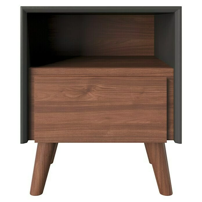 Der Nachttisch Victoria aus der Playboy-Home Kollektion von Phönix ist im Club-Stil der 60er Jahre gehalten. Der graue Korpus kombiniert mit Nussbaumdekor rundet das Retro-Design vollkommen ab. Der praktische Beistelltisch eignet sich besonders gut als Nachttisch im Schlafzimmer. Die Schublade lässt sich einfach durch die Soft-Close-Technologie durch leichtes anstoßen sanft schließen und bietet genügen Ablagefläche für Ihre Dinge. Zusätzlichen Stauraum erhält man durch die offene Ablage. Der Holztisch ist auch als Beistelltisch gut geeignet. Alle Artikel der Playboy-Home Kollektion sind farblich und im Design aufeinander abgestimmt. Alle Möbel und Accessoires ergeben zusammen ein wertiges Gesamtkonzept.