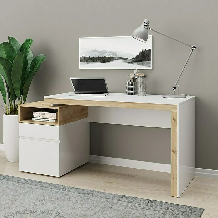 Der moderne Schreibtisch Santiago von Phönix ergänzt perfekt die moderne Home-Office Lösung und lässt keine Wünsche offen. Ausgestattet mit einem offenen Fach, einer Schublade und einem Türfach lassen sich problemlos DIN A4 Ordner, oder private Dinge verstauen. Der Schreibtisch mit dem zeitlosen Design weiß/eiche bietet viel Stauraum und ist beidseitig montierbar, er kann zusammengeschoben oder versetzt in jedes Büro gestellt werden. Die Tischplatte ist kratzfest und leicht abwaschbar.