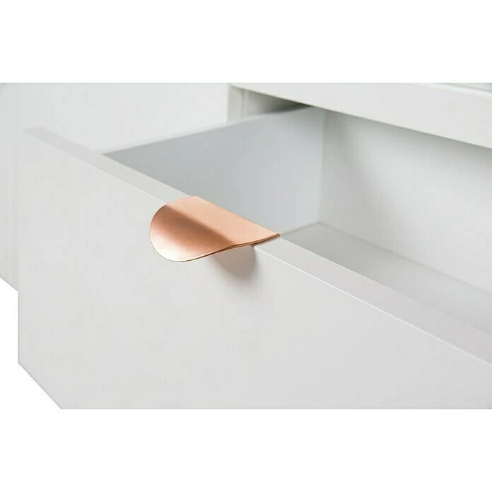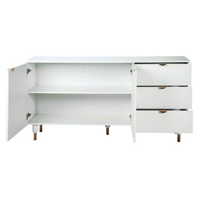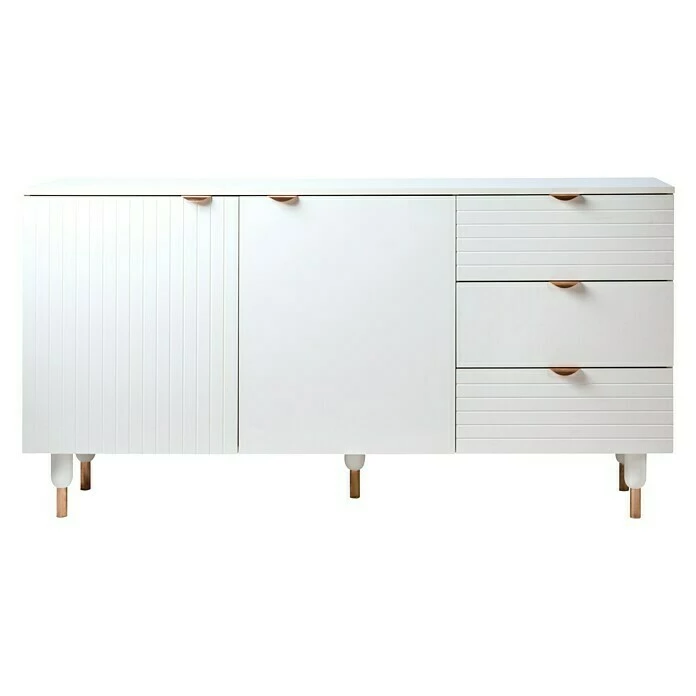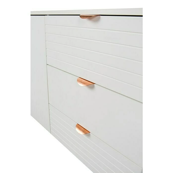 Das Sideboard Pattern von Phönix ist eine Designer Kommode mit gefrästen Fronten. Es bietet viel Stauraum und Ablagefläche für unterschiedlichste Gegenstände und verfügt über 3 Schubladen und 2 Türen. Die Türen und Schubladen mit Soft-Close Technik lassen sich einfach öffnen und durch leichtes anstoßen sanft schließen. Die Metallfüße mit rosegoldenen Metallakzenten runden das moderne Design vollkommen ab.