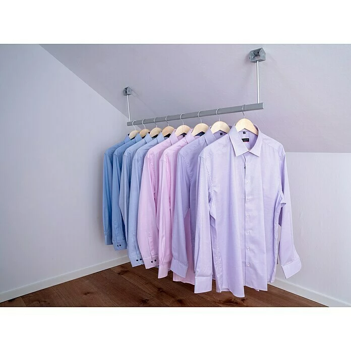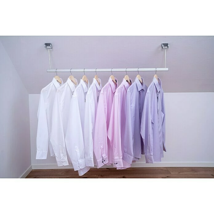 Mit dem Room Plaza Easy Doing Kleiderstangen-Set inklusive Halterungen lässt sich vorhandener Platz in Dachschrägen effektiv nutzen. Die feste Kleiderstange kann einfach mit den im Lieferumfang enthaltenen Winkeln an der Schräge montiert werden. Sie ist die ideale Ergänzung in einem begehbaren Kleiderschrank und bietet genügend Raum für Blusen, Kleider, Jacken und Mäntel. Auf Maß gefertigte Room Plaza Raum- und Ausbausysteme sind exklusiv im BAUHAUS Fachcentrum bestellbar.