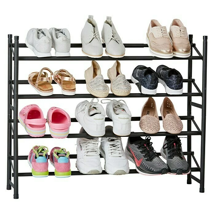 Dieses freistehende Schuhregal kann auf seinen vier Böden bis zu 5 Paar Schuhe pro Ebene aufbewahren. Dank der verstellbaren Breite lässt es sich an den zur Verfügung stehenden Platz anpassen. Es ist schwarz, praktisch und einfach zu installieren. Es ist möglich, 2 Regale übereinander zu stapeln, um den Stauraum zu vergrößern.