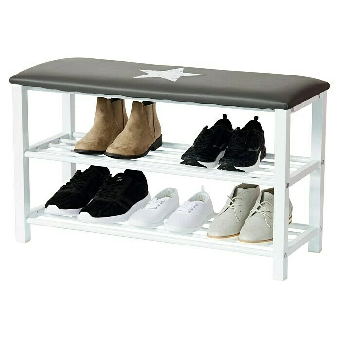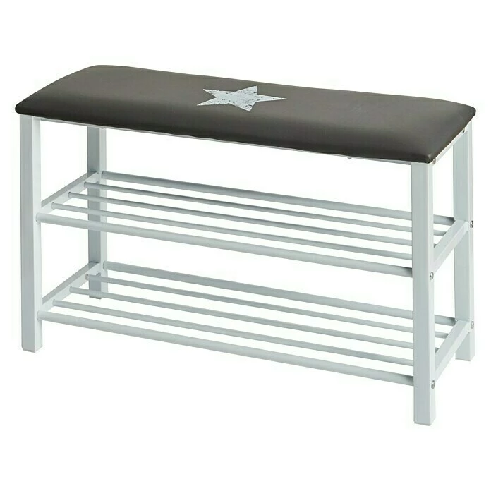 Das Schuhregal mit Sitzbank bietet eine bequeme und stilvolle Art der Schuhaufbewahrung. Dank der zwei Ablagefächer ist ausreichend Platz für Schuhe vorhanden und das mit weichem, hochwertigem Kunstleder bezogene Sitzkissen mit aufgedrucktem Stern im Vintage Design bietet eine bequeme Sitzfläche. Das Schuhregal ist bis 100 kg belastbar.
