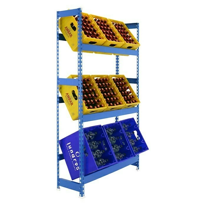 Das Getränkekistenregal Bottleclick von Simon Rack eignet sich ideal zur Einlagerung von bis zu Getränkekisten in Vorratsräumen, Werkstatt oder Garage. Das stabile Regal verfügt über mehrere Ebenen mit einer jeweiligen Traglast von 100 kg. Dank der schrägen Lagerung der Kisten ist die Flaschenentnahme jederzeit problemlos möglich. Die Montage gestaltet sich dank des Stecksystems sehr einfach.