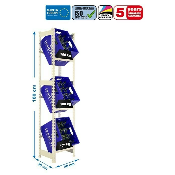 Das Getränkekistenregal Bottleclick von Simon Rack eignet sich ideal zur Einlagerung von bis zu Getränkekisten in Vorratsräumen, Werkstatt oder Garage. Das stabile Regal verfügt über mehrere Ebenen mit einer jeweiligen Traglast von 100 kg. Dank der schrägen Lagerung der Kisten ist die Flaschenentnahme jederzeit problemlos möglich. Die Montage gestaltet sich dank des Stecksystems sehr einfach.