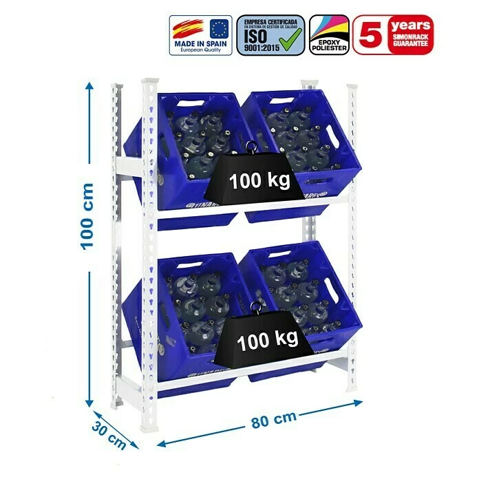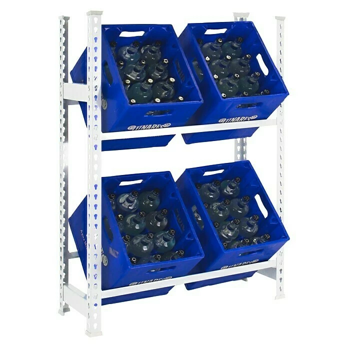 Das Getränkekistenregal Bottleclick von Simon Rack eignet sich ideal zur Einlagerung von bis zu Getränkekisten in Vorratsräumen, Werkstatt oder Garage. Das stabile Regal verfügt über mehrere Ebenen mit einer jeweiligen Traglast von 100 kg. Dank der schrägen Lagerung der Kisten ist die Flaschenentnahme jederzeit problemlos möglich. Die Montage gestaltet sich dank des Stecksystems sehr einfach.