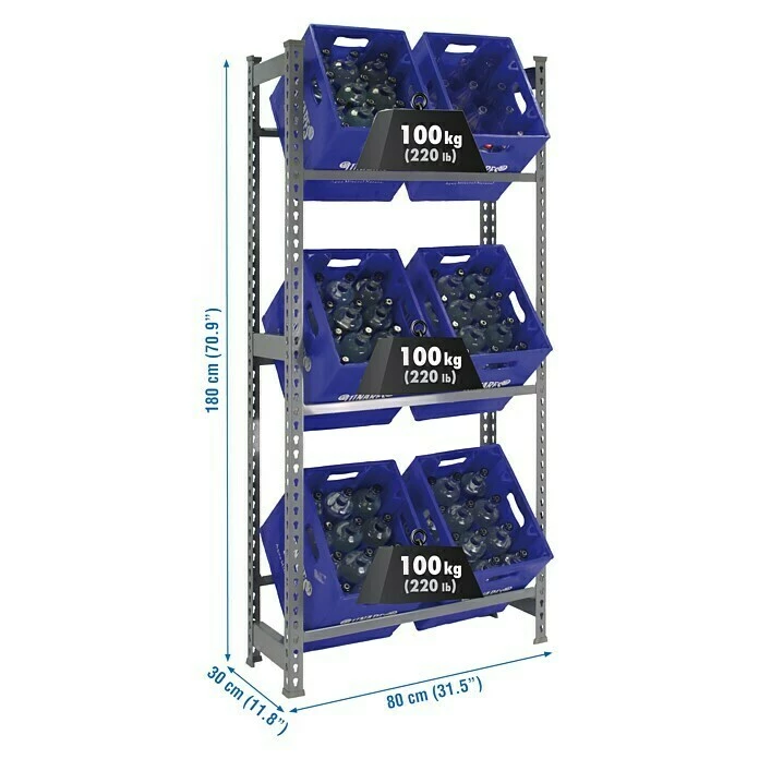 Das Getränkekistenregal Bottleclick von Simon Rack eignet sich ideal zur Einlagerung von bis zu 6 Getränkekisten in Vorratsräumen, Werkstatt oder Garage. Das stabile Regal verfügt über 3 Ebenen mit einer jeweiligen Traglast von 100 kg und bietet Platz für maximal 2 Kisten pro Ebene. Dank der schrägen Lagerung der Kisten ist die Flaschenentnahme jederzeit problemlos möglich. Die Montage gestaltet sich dank des Stecksystems sehr einfach.