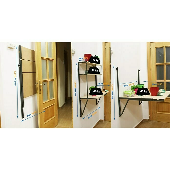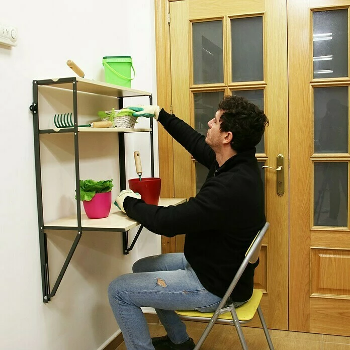 Das Simonflex Hängeregal von Simonrack ist eine praktische Lösung für kleine Räume. Es lässt sich zu einem Regal mit 3 Böden oder einem Schreib- oder Arbeitstisch ausklappen. Wenn das Regal nicht mehr gebraucht wird, kann man es leicht einklappen und so verschwinden lassen. Die beiden oberen Böden haben eine Traglast von 20kg und der große untere Boden 40kg.