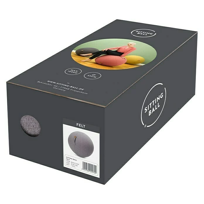Optimal geeignet ist der Sitting Ball Felt für eine Körpergröße von 160 – 180 cm und einem Maximalgewicht von 100 kg. Geliefert wird der Ball in einem Karton mit den Maßen 39 x 19 x 14,5 cm und kann nach Erhalt bis 140 l in gewünschtem Volumen mit Luft befüllt werden.