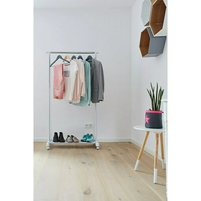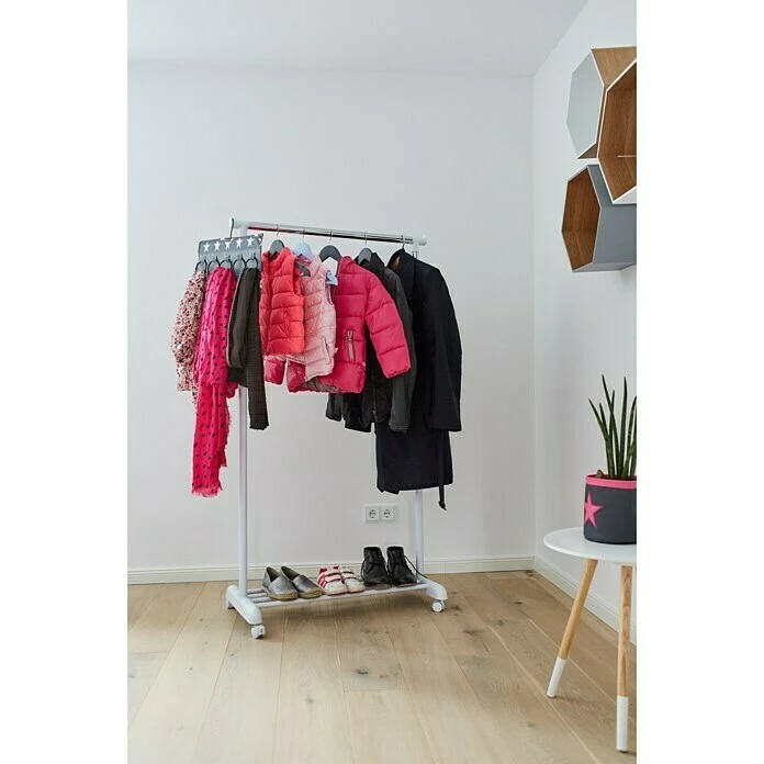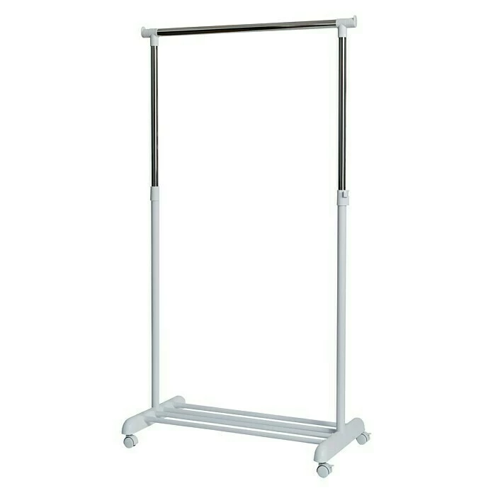 Der Kleiderständer eignet sich zum Verstauen von Jacken und Schuhen. Er ist mit einer Teleskopkleiderstange ausgestattet um ein Maximum an Stauraum zur Verfügung zu stellen. Der Kleiderständer lässt sich einfach, ohne Schrauben, durch ein Stecksystem aufbauen und lässt sich dank der Rollen bequem verschieben.