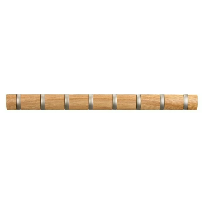 Die Garderobe von Umbra zeichnet sich durch ihr schlichtes Design aus. Die Garderobenleiste ist mit 8 Haken ausgestattet, die sich bei Nichtbenutzung einfach wegklappen lassen. Jeder Garderobenhaken erbringt eine Tragfähigkeit von 2,2 kg. Die Leiste ist aus stabilem und langlebigem Holz gefertigt, während die Haken aus robustem Metall bestehen. Die Montage erfolgt einfach und bequem an der Wand über Schrauben. Die befestigten Schrauben sind versteckt, sodass sie das schlichte und dezente Design der Garderobenleiste nicht stören.