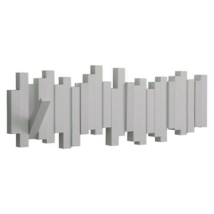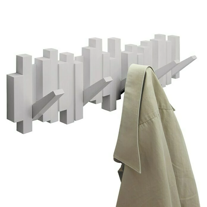Die Garderobe von Umbra zeichnet sich durch ihr schlichtes Design aus. Die Garderobenleiste ist mit 5 Haken ausgestattet, die sich bei Nichtbenutzung einfach wegklappen lassen. Jeder Garderobenhaken erbringt eine Tragfähigkeit von 2,2 kg. Die Leiste ist aus stabilem und robustem Kunststoff gefertigt. Die Montage erfolgt einfach und bequem an der Wand über Schrauben. Die befestigten Schrauben sind versteckt, sodass sie das schlichte und dezente Design der Garderobenleiste nicht stören.