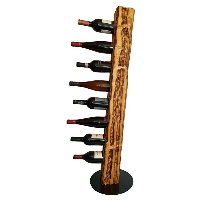 Dieser aus Massivholz in deutscher Handarbeit künstlich auf alt gestylte Weinständer, welcher sich nahtlos in jede Einrichtung einfügt, ist, aufgrund seiner ihm verliehenen Struktur, ein Unikat. Er eignet sich ideal als Geschenk für jeden Weinliebhaber oder für die perfekte Präsentation Ihres guten Weines. Die unterschiedlichen Narben, Risse und Einkerbungen verleihen dem Weinregal seine individuelle Note mit eigenem Charme und Charakter. Dieser Weinhalter weist eine Höhe von 113 cm und einen Durchmesser von 30 cm auf. Er bietet Platz für 8 Weinflaschen bei einem stabilen Stand auf einer runden, schwarz lackierten Stahlplatte. Die Flaschenhalterungen sind für Flaschen bis zu 80 mm Durchmesser (handelsübliche 0,75 l Flaschen) vorgesehen und bieten zudem mit ca. 8 cm Bohrtiefe einen stabilen Halt.