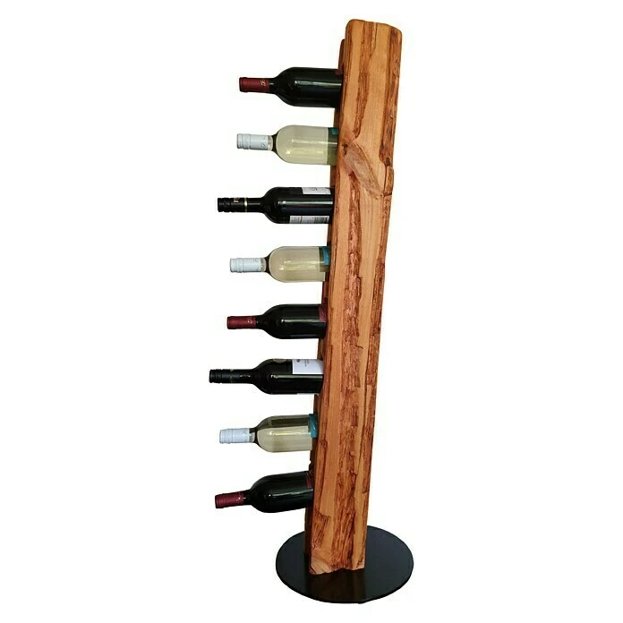 Dieser aus Massivholz in deutscher Handarbeit künstlich auf alt gestylte Weinständer, welcher sich nahtlos in jede Einrichtung einfügt, ist, aufgrund seiner ihm verliehenen Struktur, ein Unikat. Er eignet sich ideal als Geschenk für jeden Weinliebhaber oder für die perfekte Präsentation Ihres guten Weines. Die unterschiedlichen Narben, Risse und Einkerbungen verleihen dem Weinregal seine individuelle Note mit eigenem Charme und Charakter. Dieser Weinhalter weist eine Höhe von 113 cm und einen Durchmesser von 30 cm auf. Er bietet Platz für 8 Weinflaschen bei einem stabilen Stand auf einer runden, schwarz lackierten Stahlplatte. Die Flaschenhalterungen sind für Flaschen bis zu 80 mm Durchmesser (handelsübliche 0,75 l Flaschen) vorgesehen und bieten zudem mit ca. 8 cm Bohrtiefe einen stabilen Halt.