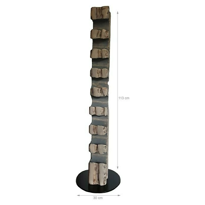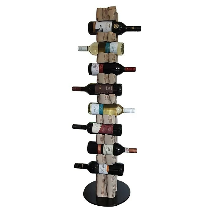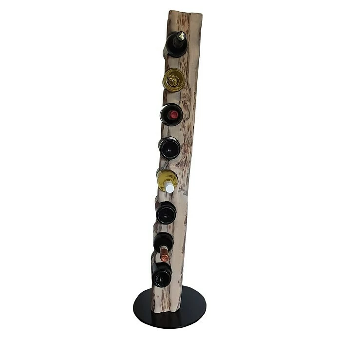 Dieser aus Massivholz in deutscher Handarbeit künstlich auf alt gestylte Weinständer, welcher sich nahtlos in jede Einrichtung einfügt, ist, aufgrund seiner ihm verliehenen Struktur, ein Unikat. Er eignet sich ideal als Geschenk für jeden Weinliebhaber oder für die perfekte Präsentation Ihres guten Weines. Die unterschiedlichen Narben, Risse und Einkerbungen verleihen dem Weinregal seine individuelle Note mit eigenem Charme und Charakter. Dieser Weinhalter weist eine Höhe von 113 cm und einen Durchmesser von 30 cm auf. Er bietet Platz für bis zu 8 Weinflaschen bei einem stabilen Stand auf einer runden, schwarz lackierten Stahlplatte. Die Flaschenhalterungen mit einem Ø von 80 mm sind speziell für handelsübliche 0,75 l Weinflaschen vorgesehen. Wir empfehlen Flaschen mit einem Ø von 68 – 80 mm zu verwenden.