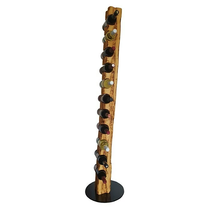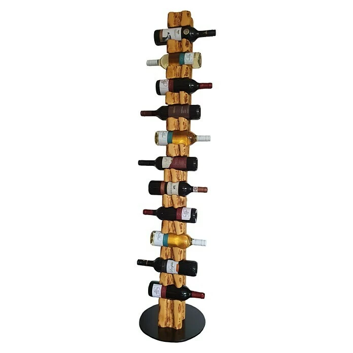 Dieser aus Massivholz in deutscher Handarbeit künstlich auf alt gestylte Weinständer, welcher sich nahtlos in jede Einrichtung einfügt, ist, aufgrund seiner ihm verliehenen Struktur, ein Unikat. Er eignet sich ideal als Geschenk für jeden Weinliebhaber oder für die perfekte Präsentation Ihres guten Weines. Die unterschiedlichen Narben, Risse und Einkerbungen verleihen dem Weinregal seine individuelle Note mit eigenem Charme und Charakter. Dieser Weinhalter weist eine Höhe von 158 cm und einen Durchmesser von 34 cm auf. Er bietet Platz für bis zu 11 Weinflaschen bei einem stabilen Stand auf einer runden, schwarz lackierten Stahlplatte. Die Flaschenhalterungen mit einem Ø von 80 mm sind speziell für handelsübliche 0,75 l Weinflaschen vorgesehen. Wir empfehlen Flaschen mit einem Ø von 68 – 80 mm zu verwenden.