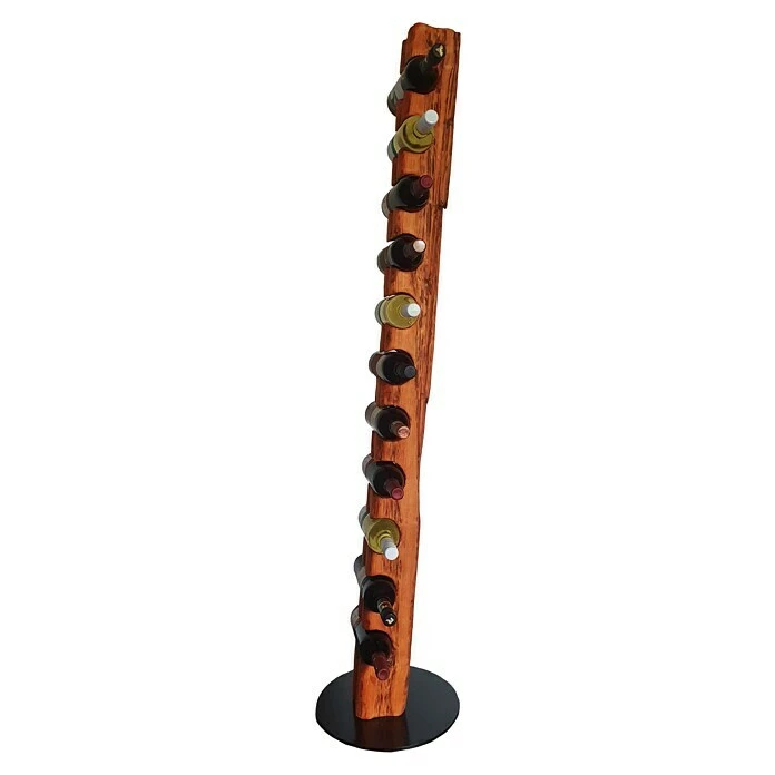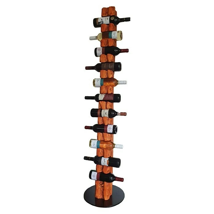 Dieser aus Massivholz in deutscher Handarbeit künstlich auf alt gestylte Weinständer, welcher sich nahtlos in jede Einrichtung einfügt, ist, aufgrund seiner ihm verliehenen Struktur, ein Unikat. Er eignet sich ideal als Geschenk für jeden Weinliebhaber oder für die perfekte Präsentation Ihres guten Weines. Die unterschiedlichen Narben, Risse und Einkerbungen verleihen dem Weinregal seine individuelle Note mit eigenem Charme und Charakter. Dieser Weinhalter weist eine Höhe von 158 cm und einen Durchmesser von 34 cm auf. Er bietet Platz für bis zu 11 Weinflaschen bei einem stabilen Stand auf einer runden, schwarz lackierten Stahlplatte. Die Flaschenhalterungen mit einem Ø von 80 mm sind speziell für handelsübliche 0,75 l Weinflaschen vorgesehen. Wir empfehlen Flaschen mit einem Ø von 68 – 80 mm zu verwenden.